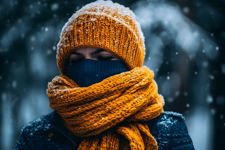 Individual in warm scarf and hat surrounded by falling snow in a chilly winter setting during nighttime