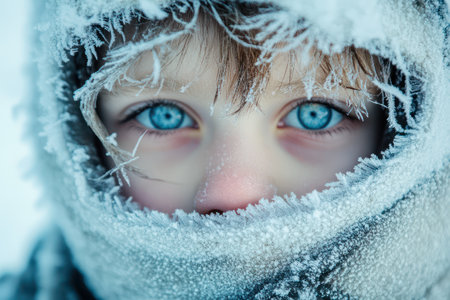 Close-up of child with icy hair strands, piercing blue eyes, and frozen surroundings, evoking winter hardship, resilience, and raw beauty.