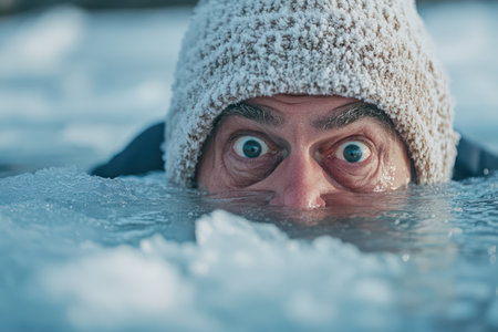 Humorous moment of a man bravely swimming in a frozen icy lake, showcasing winter sport adventure and extreme cold challenge.