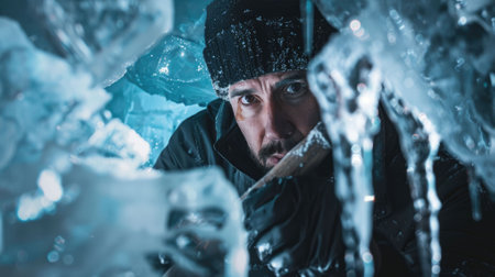 Close-up of a person's face partially covered in frosty ice, eyes gazing upwards. Wearing a warm cap, surrounded by mist or vapor, emphasizing cold, wintry conditions