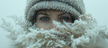 This captivating winter portrait features a close-up of a persons face surrounded by frosty plants, evoking a serene and chilly atmosphere, perfect for seasonal themes.