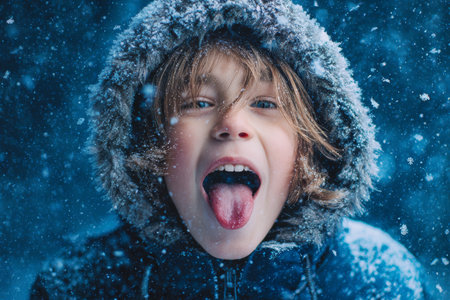 A boy is having fun in the snow, sticking out his tongue to catch snowflakes. He wears a warm coat with a furry hood, surrounded by a flurry of snow on a cold day.