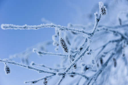 A branch covered in frost and snow. The branch is surrounded by a blue sky. Concept of calmness and serenity