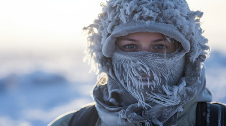 Woman with frozen eyelashes and white breath surviving in extreme cold weather