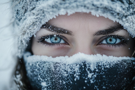 Close-up portrait of a beautiful woman with blue eyes, wearing winter clothes, her face covered in frost