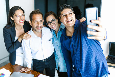 Smiling hispanic office colleagues taking selfie at meeting in conference room in Latin America