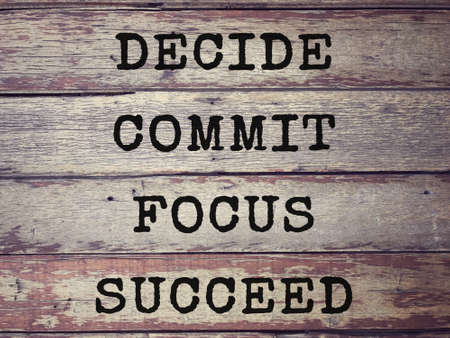 Motivational and inspirational wording - Decide, Commit, Focus, Succeed written on wooden planks. Blurred styled background.