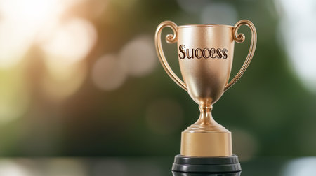Gold trophy with the word Success engraved on the plaque symbolizing achievement and victory emphasizing the concept of achievement.