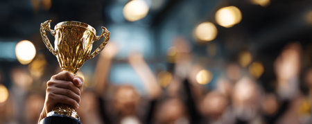 Golden trophy cup held by hand with blurred cheering crowd celebrating victory and success in competition or achievement
