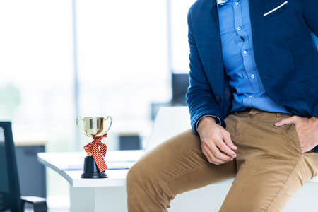 Close up fashion image of wrist in a business suit of man detail of a businessman,Man's hand in brown or gold pants pocket and wearing blue jacket a champion cup on table at In the office room.