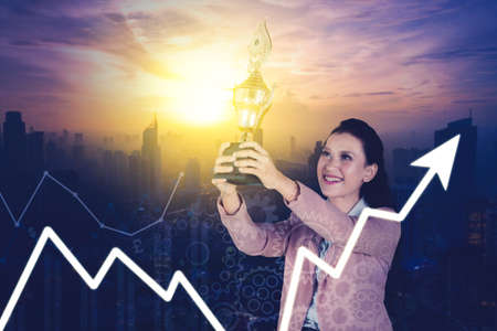 Double exposure of businesswoman holding a trophy while standing with upward arrow and cityscape background