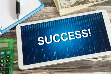 Dollar bills, calculator and a tablet PC with the text Success