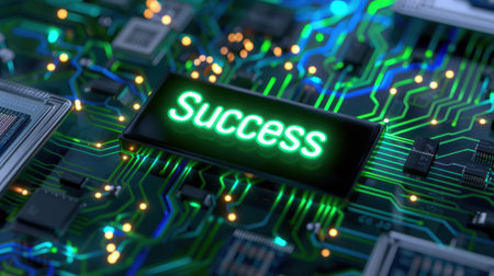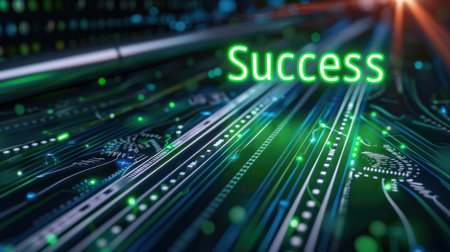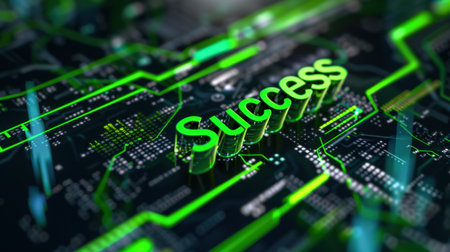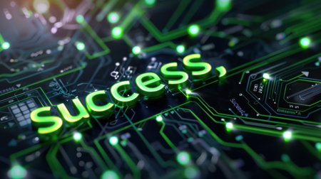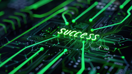 This image portrays the word success illuminated in vibrant green against a high-tech circuit board backdrop, capturing the essence of achievement in a digital world.