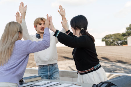 Asian College Students Celebrating Academic Success with High Fives and Smiles Outdoors on Campus