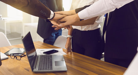 Closeup of group of business people stacking hands above office desk with laptop computer, making agreement, starting new business, setting goals. Concept of teamwork, unity, support, collaboration