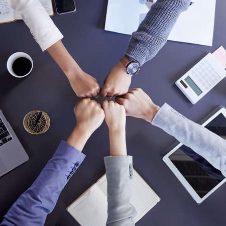 Top view of successful of group business people fist bump together at office.success mission team meeting.Friendship teamwork concept