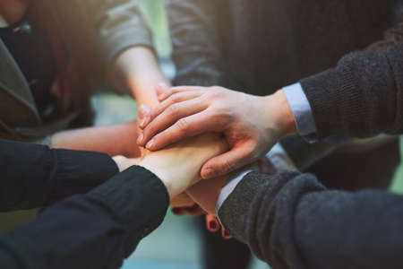 business team showing unity with putting their hands together. Close-Up of hands on top of each other