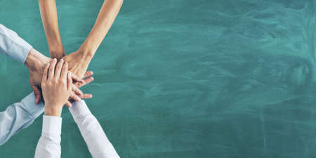 Teamwork concept with human hands in white sleeves on green chalkboard background with copyspace. Mockup