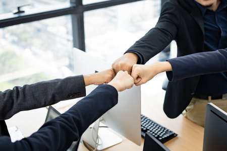 Business partnership giving fist bump to Start up new project. Business and Teamwork of Partnership concept. Corporation meeting in company or industrial work concept. selective focus on hand