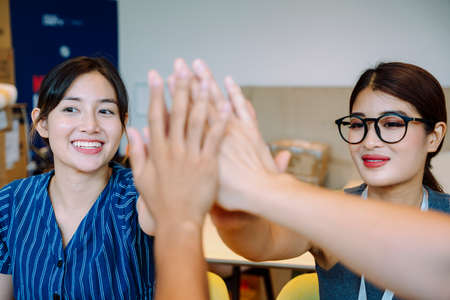 Group of Asian team creative business people join hands partnership teamwork concept