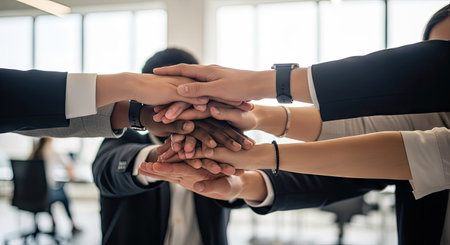 A group of people wearing business attire joining their hands together in a collaborative handshake gesture against a bright indoor setting