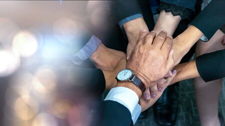 top view of young people showing their hands on top of each other. Group of businessman making a stack of hands with copy space. With post production of bokeh foreground.