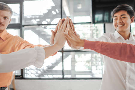 Teamwork Together Concept. Group of diversity people high five on air to greeting power of tag team. Multiethnic people group working togetherness. Volunteer collaboration in Business Team success