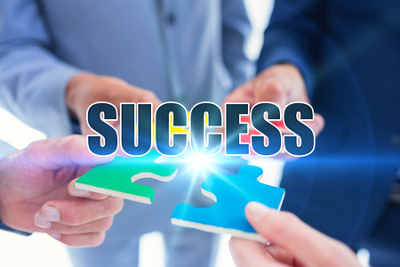 The word success against business colleagues holding piece of puzzle