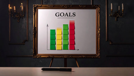 Whiteboard with GOALS header and vertical progress bars made of green/yellow/red sticky notes, marker pen beside it, office environment