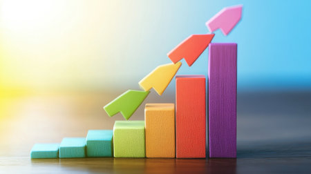 Vibrant depiction of a growth chart made with wooden blocks and colorful arrows, symbolizing business success, progress, and strategic planning.