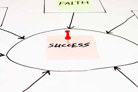 Top closeup shot of Success word written with Wooden blocks on white paper background