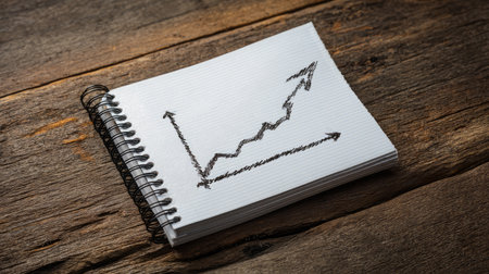 A vibrant and creative illustration of hand-drawn graphs and arrows on a notebook, showcasing financial analysis and business growth concepts in a warm workspace.