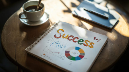 A vibrant success day workbook lies open on a wooden table beside a coffee cup and stationery, capturing a perfect blend of creativity and productivity in a cozy workspace.