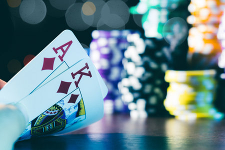 poker, pocket hand Ace King hearts suited with black chips on green felt