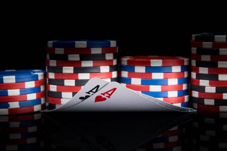 on a black background, with a reflection, pyramids of chips, for playing poker, lined up, close-up, on the two highest cards