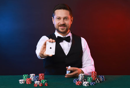Wealthy man is playing poker with an excitement at a casino on black background.