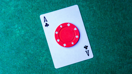 A club ace on a green felt table, with a red poker chip in sight. A perspective from above. The idea of playing poker and taking risks. High quality photo