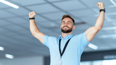 A cheerful man with a beard celebrates a victory, raising his arms in triumph, exuding joy and success.