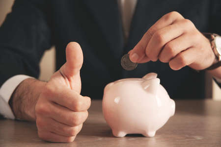 A man's hand putting a coin in a piggy Bank. The concept of saving money