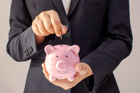 Business women who put coins in a piggy bank, the concept of saving money and saving money for the future
