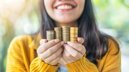 close up of woman hands holding stack coins, money concept.