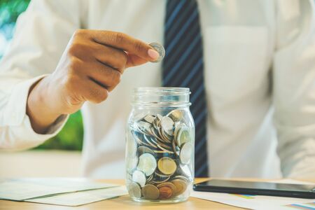 Investment and Saving money concept. businessman is putting coin in glass