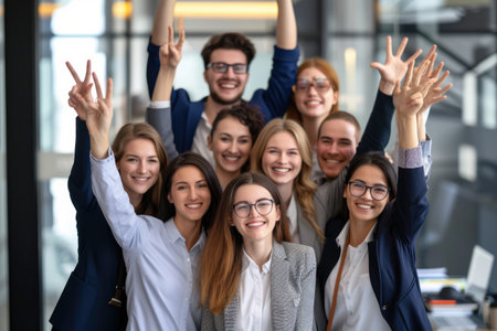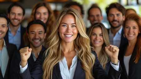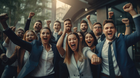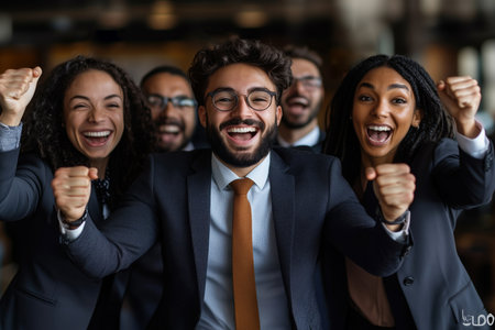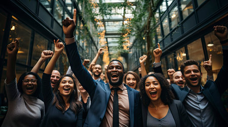 A happy and diverse team of coworkers celebrating a successful achievement in the workplace with enthusiasm and positivity. The group emanates teamwork, collaboration, and mutual respect