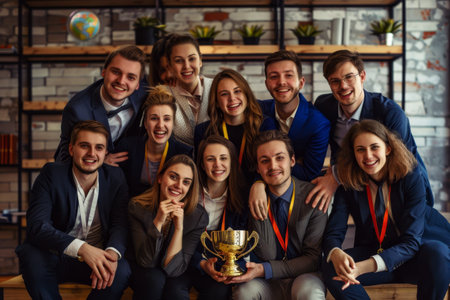 A group of people, possibly a business team, posing proudly for a picture with a trophy in hand, A business team posing for a group photo with a trophy and medals