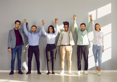 Happy confident business team holding hands raised together. Group of positive colleagues standing in line against wall in modern office, smiling at camera. Teamwork, team building and unity