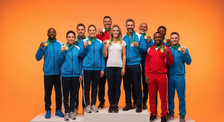 Group of diverse athletes celebrating with medals on podium against orange background