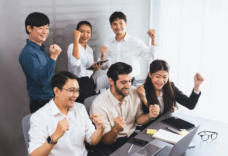 Excited and happy office worker employee celebrate after make successful strategic business marketing planning. Teamwork and positive attitude create productive and supportive workplace. Prudent