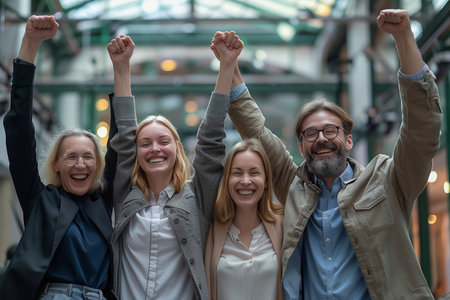 A group of diverse individuals smiles and laughs joyfully, arms raised in celebration. The composition features a shallow depth of field, with soft, natural lighting. The image suggests a sense of camaraderie, perfect for commercial projects highlighting unity and positive emotions. It