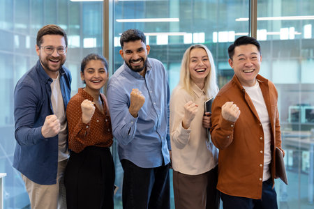 A diverse group of professional stand together in a modern office, celebrating with raised fist and smile. The atmosphere is lively and filled with positivity, showcasing teamwork and achievement.