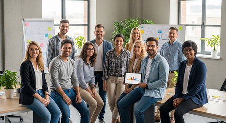 A diverse team in casual attire at a modern office
